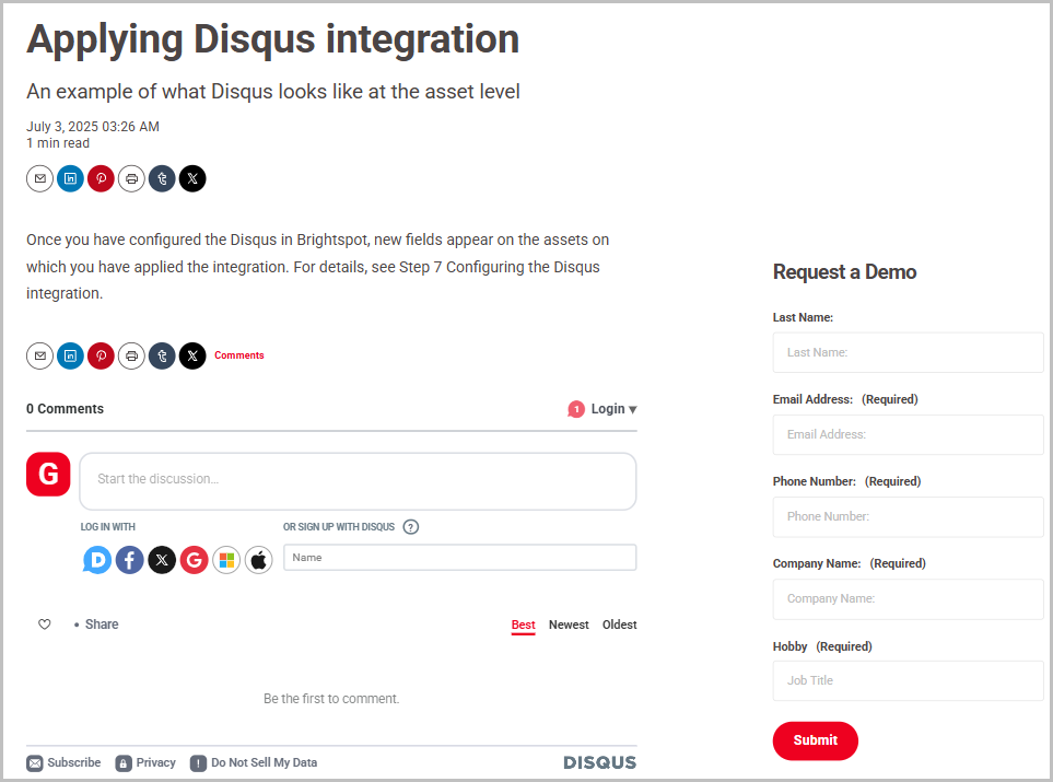Once you have configured the Disqus in Brightspot, new fields appear on the assets on which you have applied the integration. For details, see step 7 Configuring the Disqus integration.