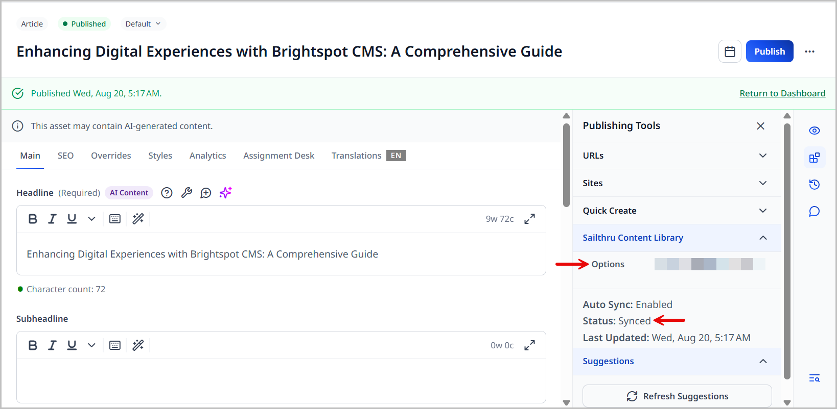 After you publish the asset, the Sailthru widget updates to show that the asset has been synced with the Sailthru Content Library. The Options button is also available now.