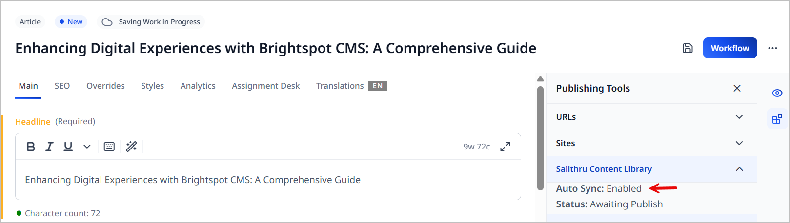 When you open a content type that has been enabled for Auto-Sync, it will be reflected in the Sailthru widget as seen in the image below. Once that asset is published, the data from the Overrides > Promo Overrides cluster is sent to Sailthru.