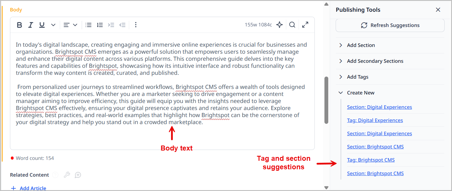 Brightspot scans your existing sections and tags, looking for the ones that most reflect the article's text. Because this article includes the keywords Brightspot, CMS, and capabilities, Brightspot suggests applying the existing section Brightspot CMS capabilities to this article.